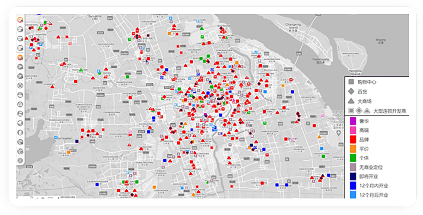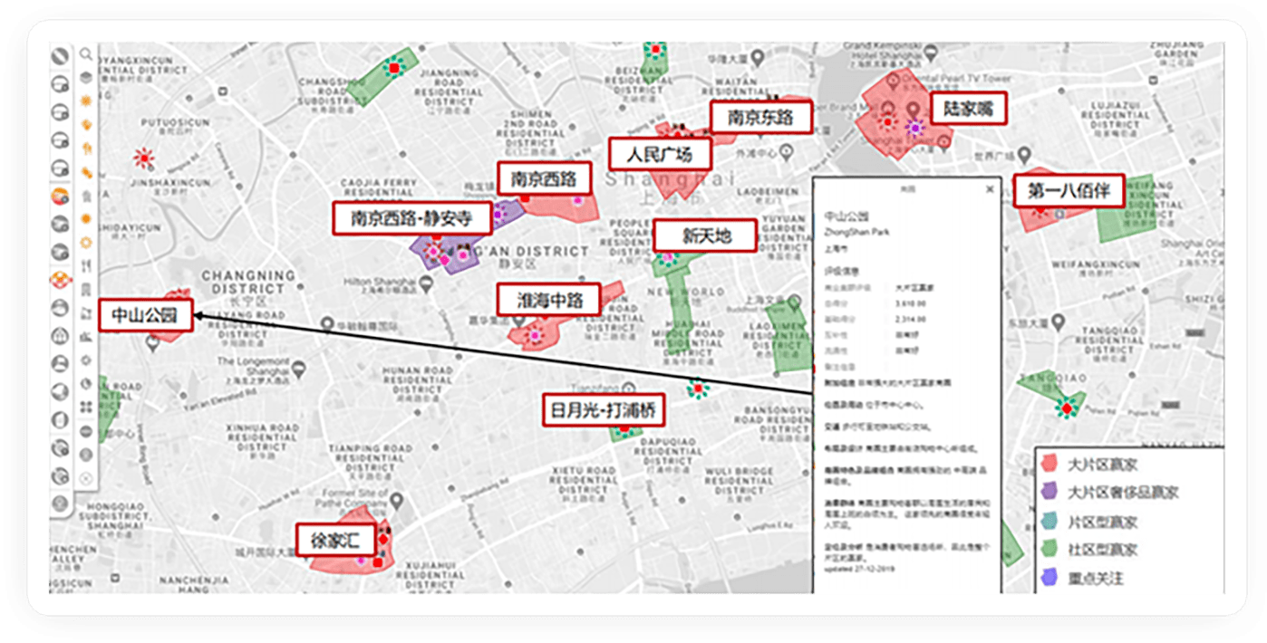 由專業的城市分析人員團隊及零售專家繪制,包含競爭情況、零售組合、商圈范圍及人流循環、零售商業項目聚集情況等