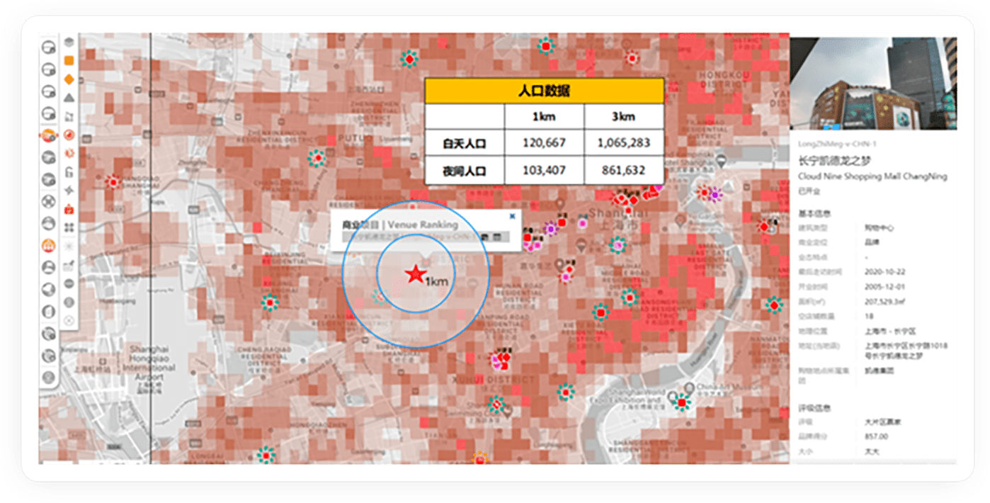 匯納云盯提供包含商業環境、商圈概況、商場基礎信息商場品牌庫、互聯網數據等持續迭代的一個標準化實體商業數字底座